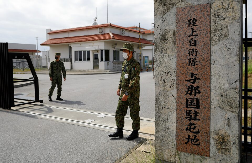 Soldiers of the Japan Ground Self-Defense Force stand at the entrance gate of their base on Japan's westernmost inhabited island of Yonaguni, Okinawa Prefecture, on 26 October 2021. Source: Reuters