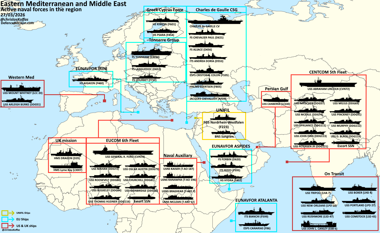 On 1 March, following Iran's strike on Cyprus, the response was immediate. Over 15 European warships were dispatched to the Mediterranean. France deployed its carrier strike group; the United Kingdom contributed additional vessels and aircraft; Spain sent a warship. Greece committed two frigates, including the newly delivered Kimon - commissioned only in December 2025 and not yet fully operational. The Netherlands and Italy also contributed to the naval deployment.
