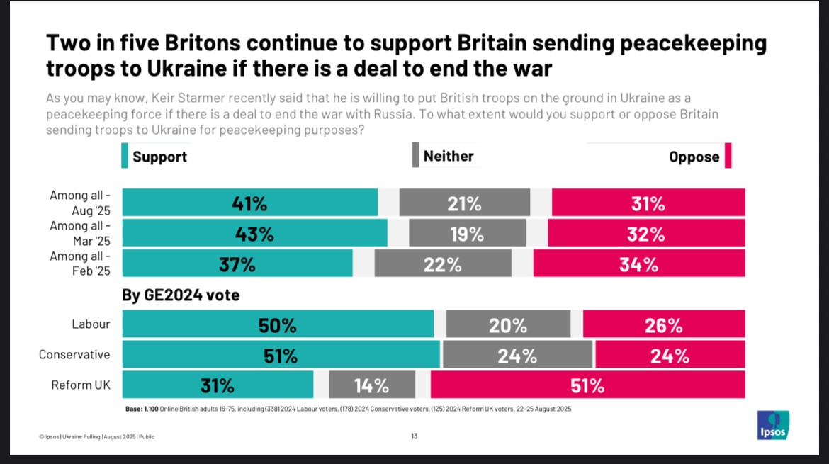 The British themselves have conflicting views on sending their troops to Ukraine. According to an Ipsos poll (15 September 2025), 41% of Britons support such a decision, although in March this year the figure was 52% (YouGov poll). However, 55% of Britons generally support the United Kingdom giving Ukraine security guarantees similar to those provided by NATO.Two out of five Britons continue to support sending British peacekeeping forces to Ukraine after an agreement to end the war. Source: Ipsos
