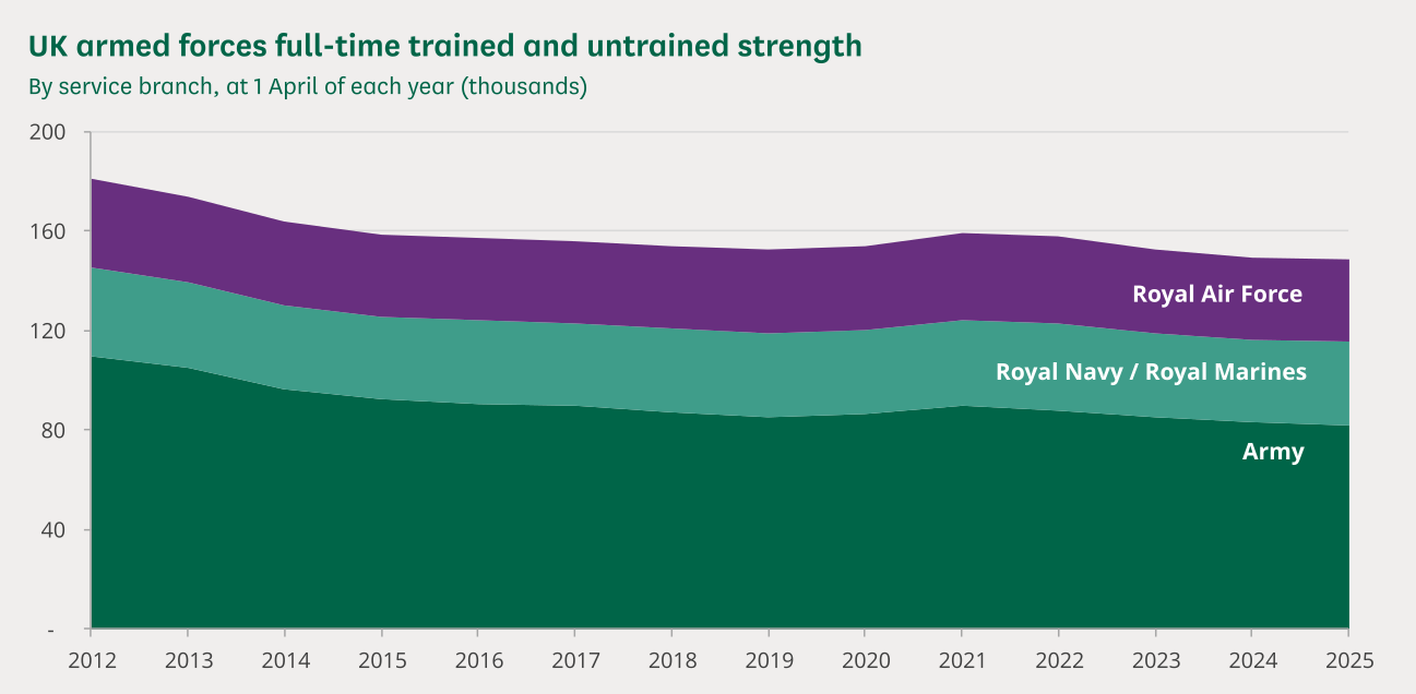 In February 2025, the think tank "UK in a Changing Europe" stated that the UK was ‘unprepared for a long-term conflict,’ despite the fact that from 2014 to 2023, the country consistently spent more than 2.1% of its GDP on defence, with the sixth largest military budget in the world (£53.9 billion in 2023/24). In February, Prime Minister Keir Starmer announced an increase in UK defence spending to 2.5% of GDP till 2027 and to 3% during the next parliamentary term.UK Armed Forces: full-time personnel (trained and untrained) as of 1 April (in thousands). Source: House of Commons Library