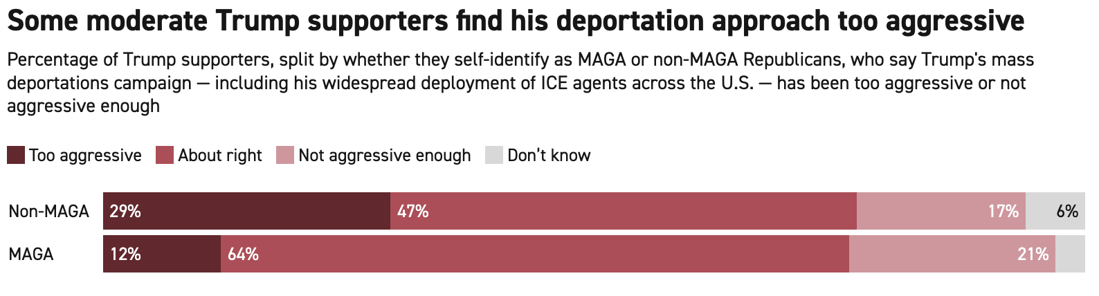 Remarkably, this increase is provided precisely by Trump's supporters. 29% of moderate Republicans consider the approach to deportations too harsh, while 43% support the campaign's goals but not the way they are implemented.