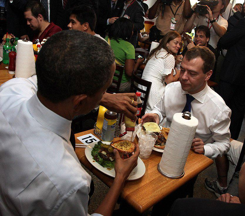 Russian President Dmitry Medvedev eats at Ray's Hell Burger with U.S. President Barack Obama in Arlington, Virginia, 2010. Mandel Ngan, AFP