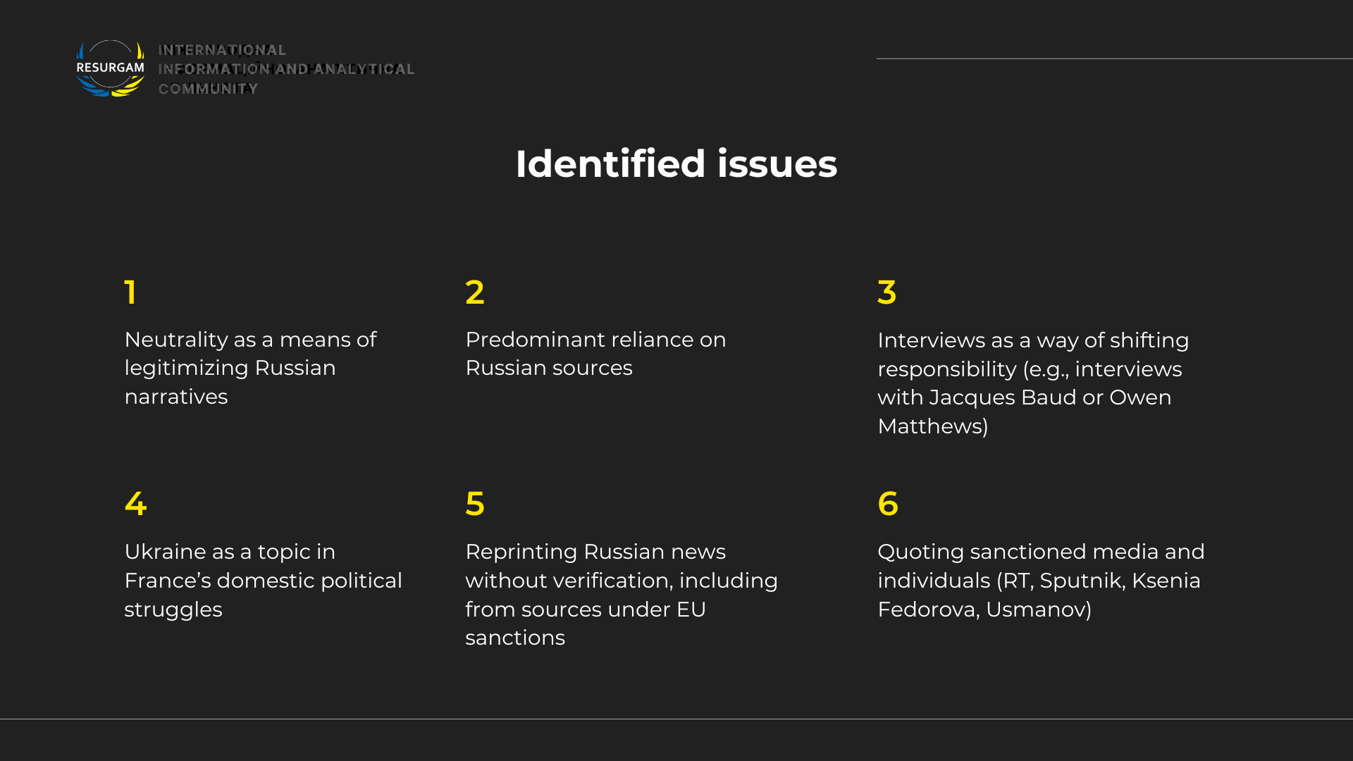 The team also compiled a list of authors who systematically violate journalistic standards, spread distorted information, and may contribute to the amplification of Russian narratives. This, in turn, affects how the French audience perceives Russia’s war against Ukraine.