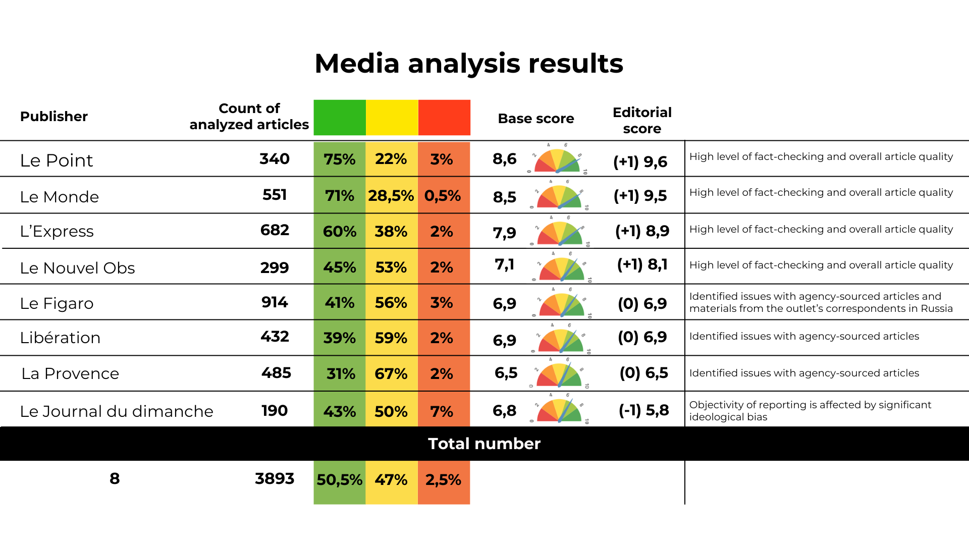 Green zone (50.5%) — high-quality and objective reporting. The highest scores were recorded for Le Point, Le Monde, L’Express, and Le Nouvel Obs.