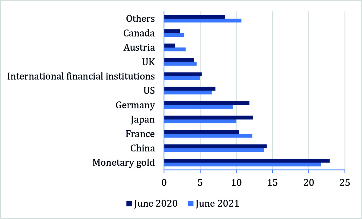 Географічний розподіл валютних та золотовалютних активів Центрального банку Росії (%)