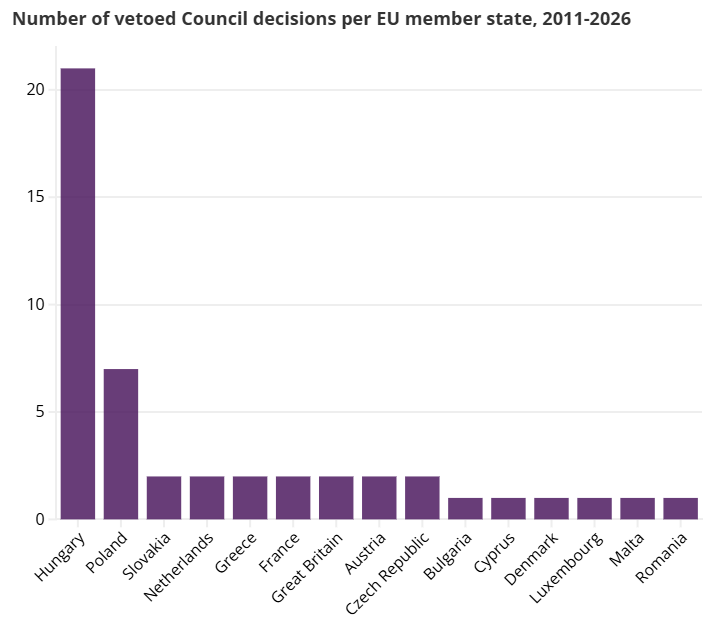 Кількість застосованих вето щодо рішень Ради ЄС за країнами-членами у 2011–2026 роках. Дані та графік — Елізабет Гайнц. Джерело
