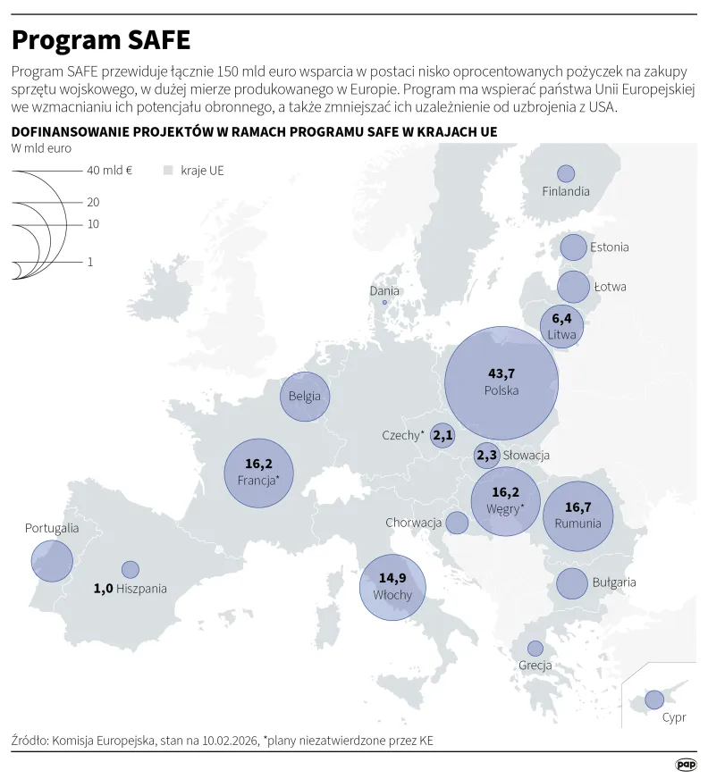 Станом на лютий 2026 року програма передбачає перші 150 млрд євро інвестицій для країн ЄС з подальшою можливістю розширення програми. Польща, яка отримає 43,7 млрд євро пільгових кредитів, є найбільшим бенефіціаром програми. Подібний обсяг інвестицій для країни означає можливість швидко покрити необхідні витрати на створення програми “Сян”, про яку ми писали в нашому матеріалі, “Східний щит” та ще понад 130 проєктів, які, у тому числі розвиватимуть національну промисловість Польщі. Програма SAFE також показує, що майбутня інтеграція України в ЄС означатиме не лише доступ до європейського оборонного ринку, а й можливість отримувати фінансову підтримку для розвитку власних збройних сил, що суттєво посилить обороноздатність країни на системному рівні.