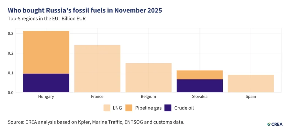 Хто купував російські викопні види палива в листопаді 2025 року, топ-5 регіонів ЄС. Джерело