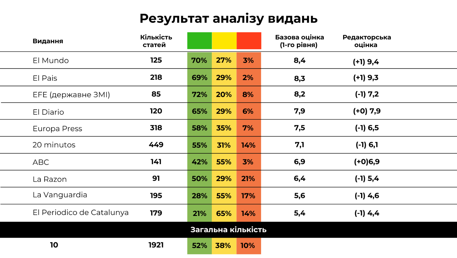 Видання El Mundo та El País показали найвищий рівень об’єктивності та достовірності у своєму висвітленні війни Росії проти України. Обидва видання мають високий рівень верифікації інформації.