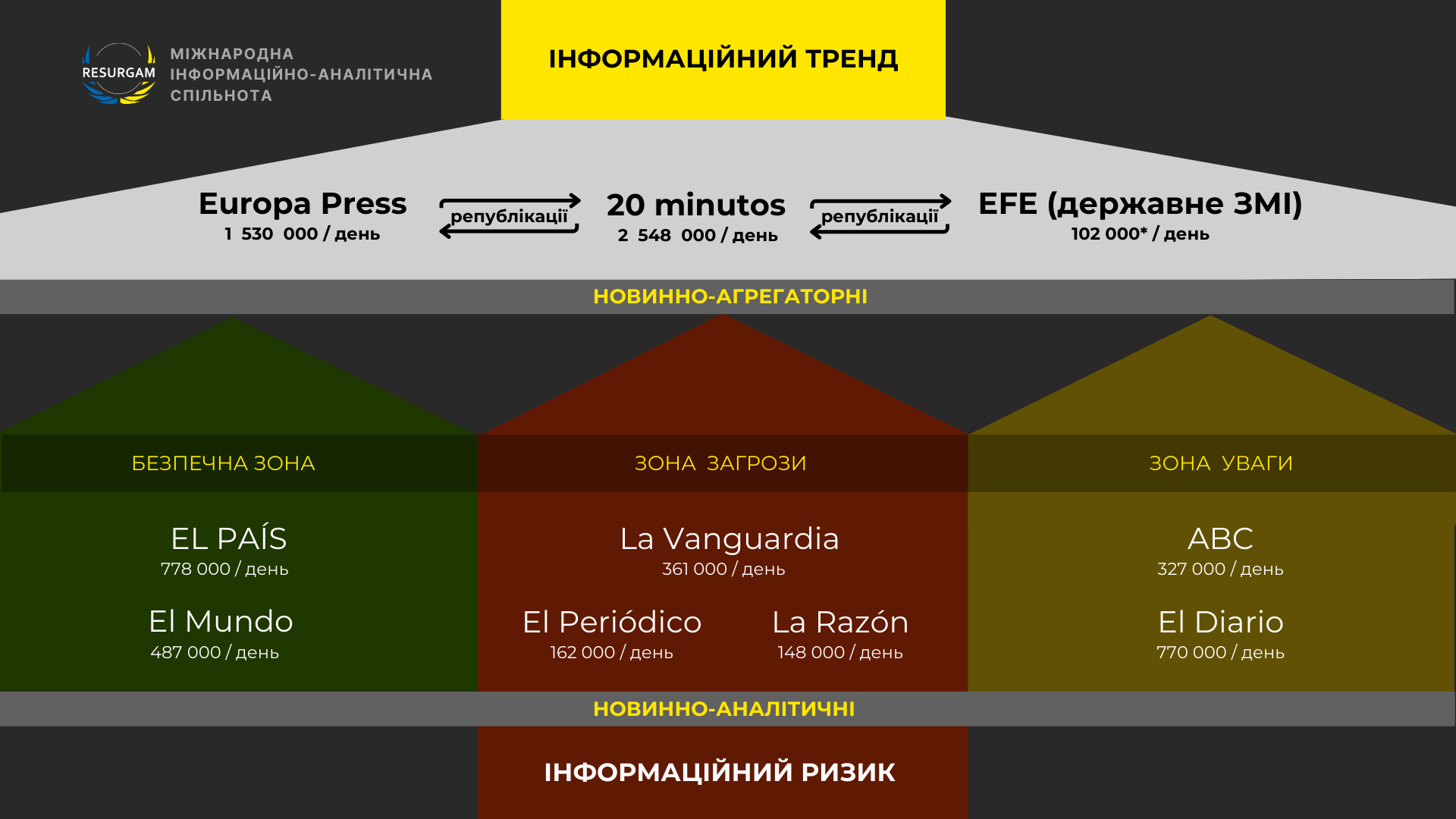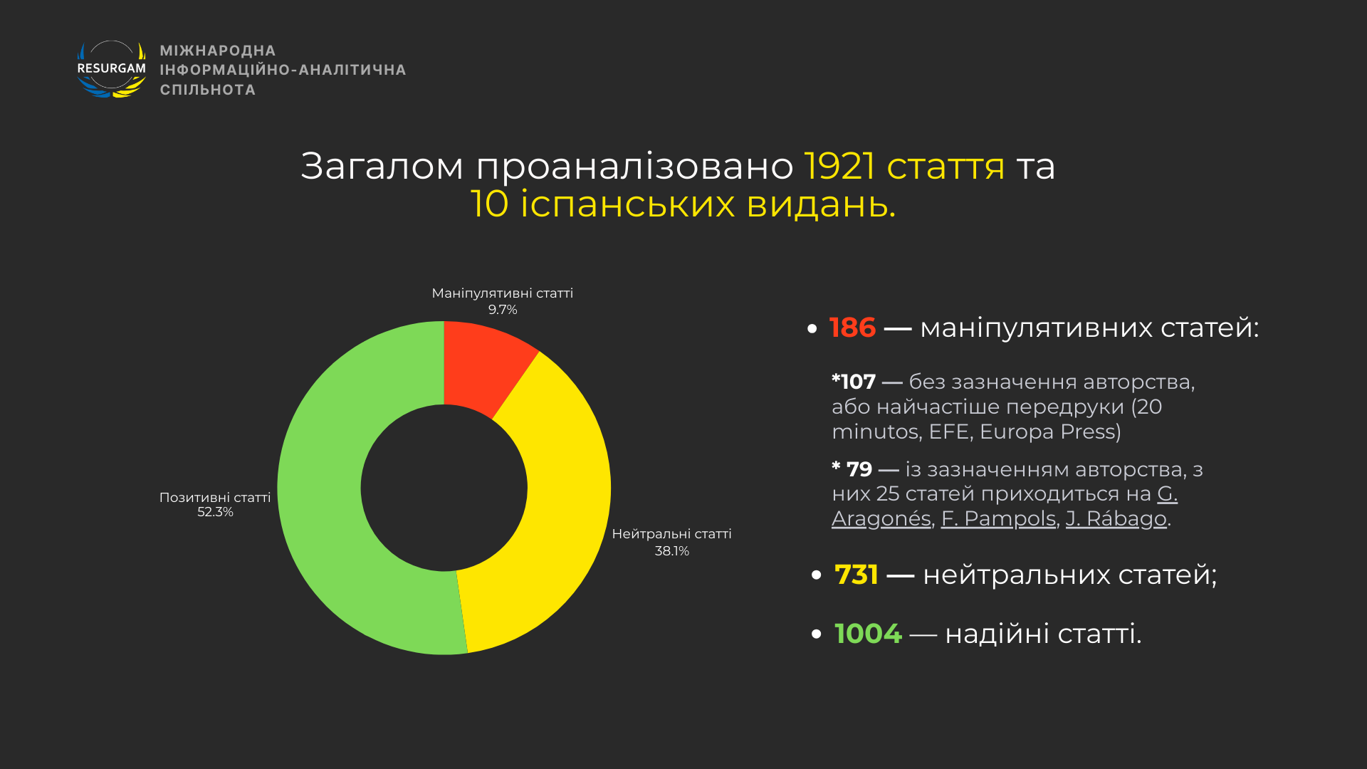 Іспанія стала першим об’єктом нашого дослідження. У період з травня по липень 2025 року спільнота Resurgam проводила дослідження провідних іспанських ЗМІ. Ми сформували перелік авторів, які непрофесійно поширюють інформацію про російське вторгнення, порушуючи журналістські стандарти, та цілеспрямовано викривлюють факти, що сприяє поширенню російської дезінформації та погіршенню рівня іспансько-українських відносин.